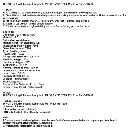 10 STÜCKE Auto Licht Rohrlampe birne P21W BA15S 7506 12 V 21 Watt Für OSRAM