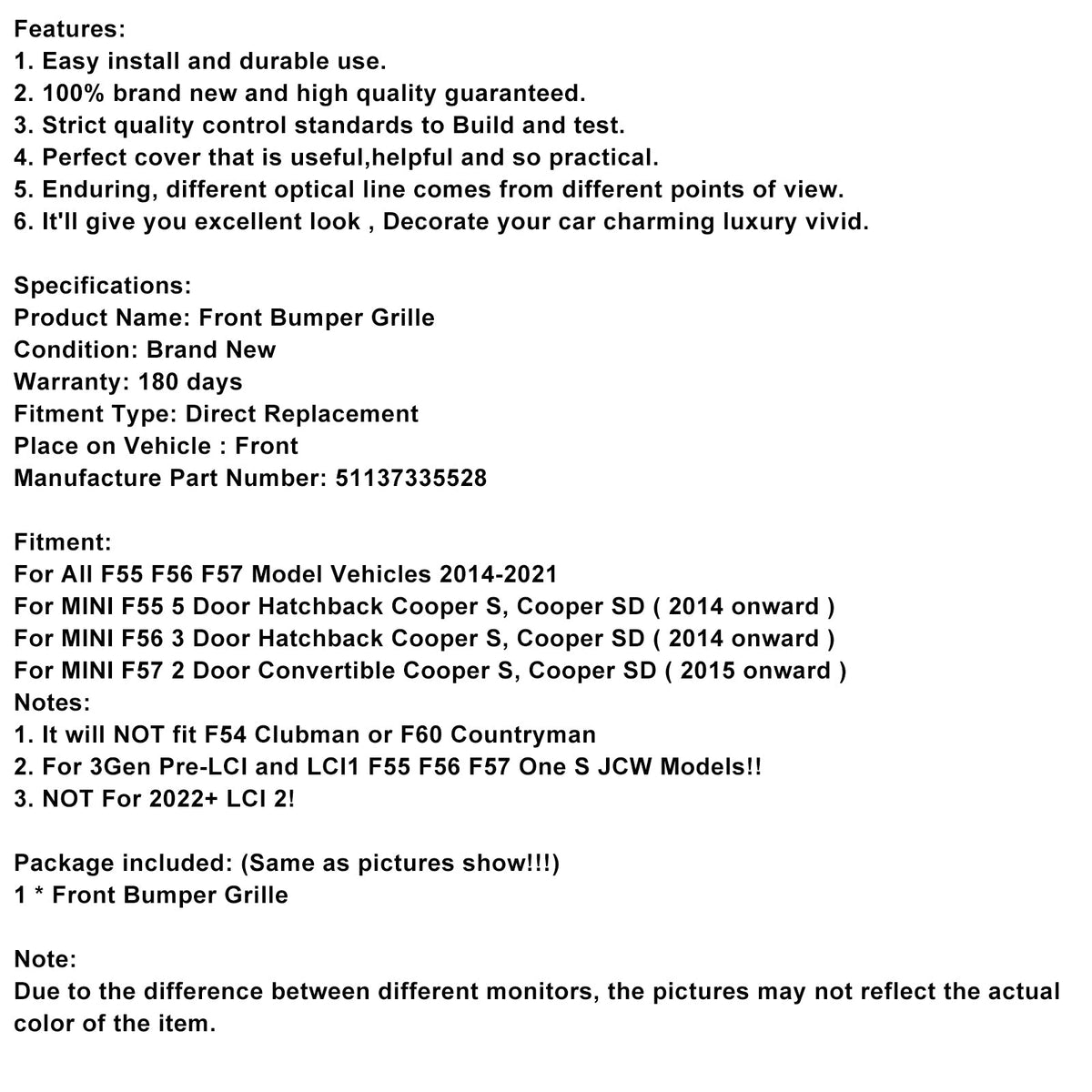 Schwarzer Frontgrill 51137335528 Passend für Mini Cooper F55 F56 F57 2014-2021