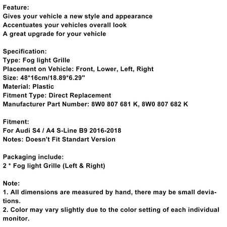 2 STÜCKE Nebelscheinwerfer Abdeckung Kühlergrill Grill Fit AUDI A4 B9 S-Linie S4 2016-2018
