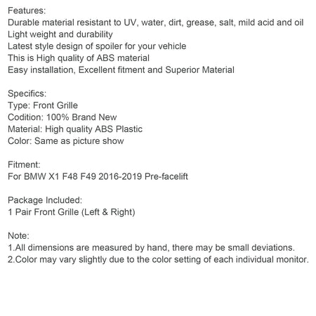 2 STüCKE Glanz Schwarz Front Nierengrill Grille Fit für BMW X1 F48 F49 2016-2019