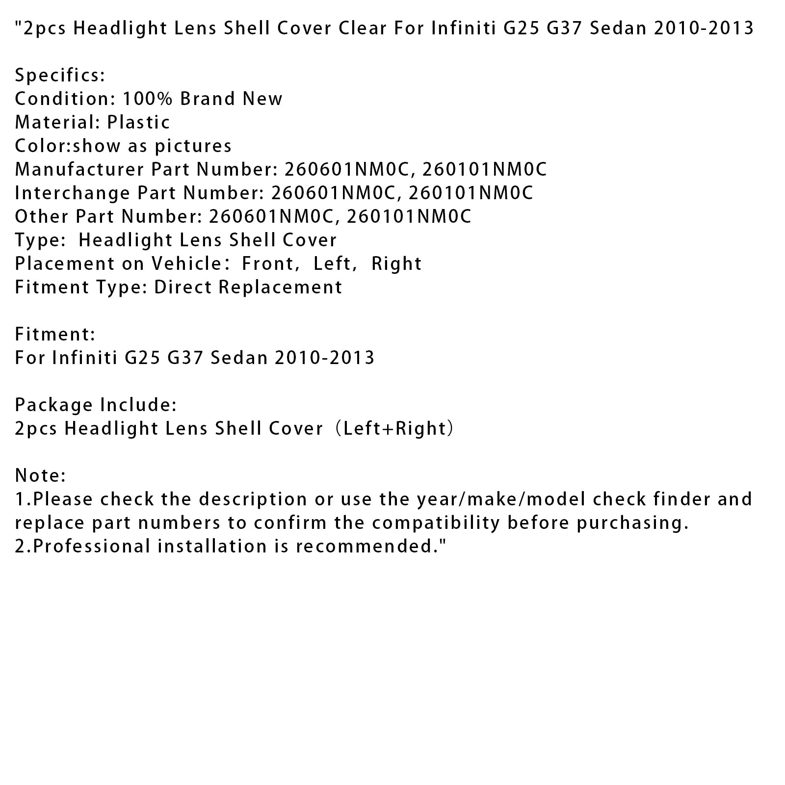 2010–2013 Infiniti G25 G37 Limousine, 2 Stück, Scheinwerfer-Objektivabdeckung, klar