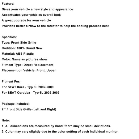 2PCS Honeycomb Kühlergrill Grill Fit für Seat Ibiza Cordoba 6L 2002-2009 FR