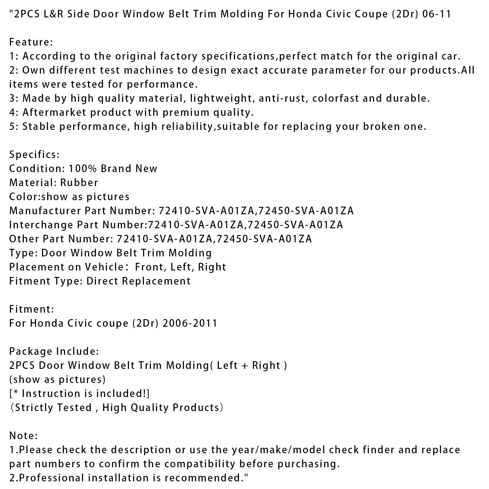 2 STÜCKE L & R Seitentür Fenster Gürtel Zierleiste Für Honda Civic Coupe (2Dr) 2006-2011