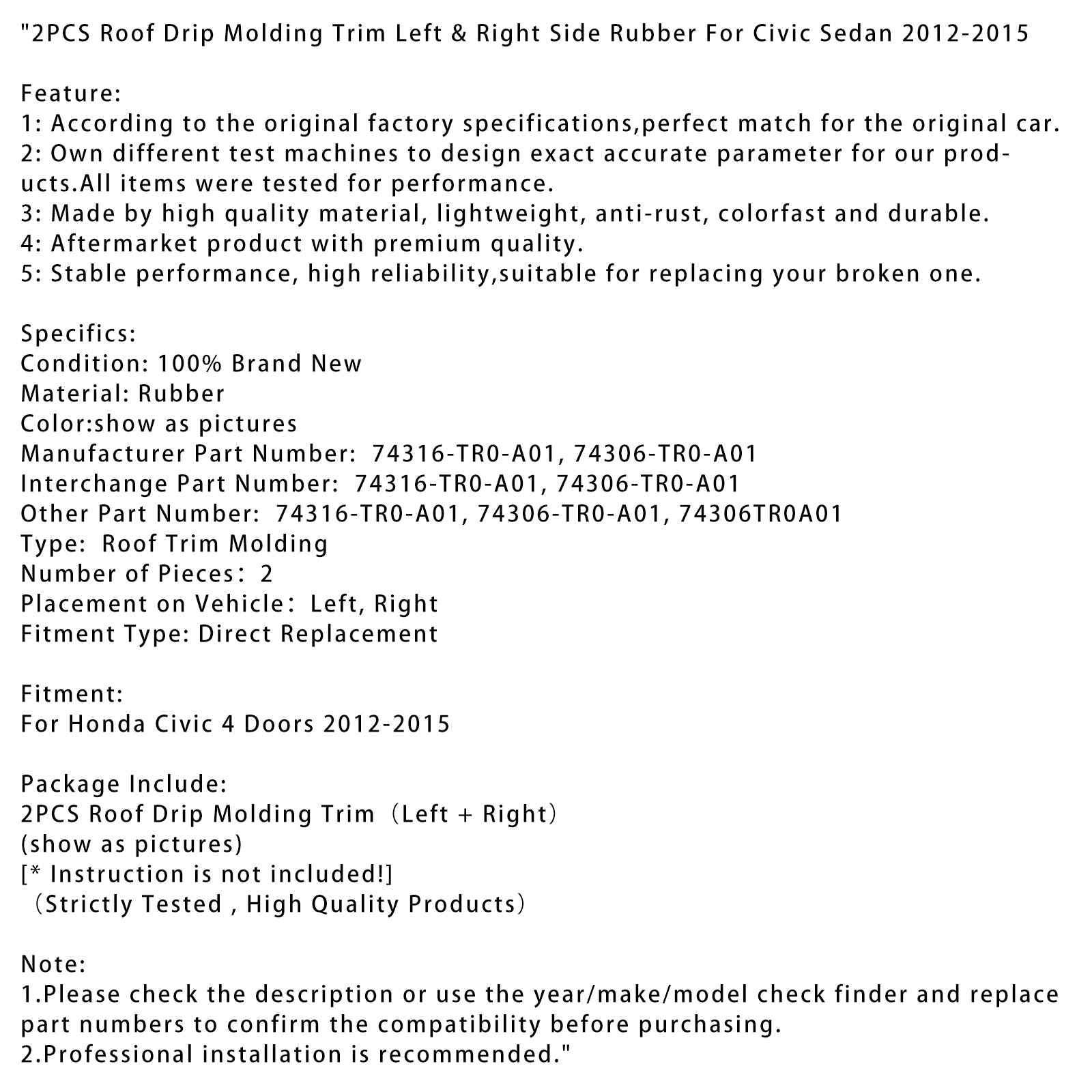 2 STÜCKE Dachtropfleiste Trim Links und Rechts Gummi Für Civic Limousine 2012-2015