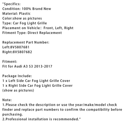 2X Auto Front Stoßstange Nebel Licht Gitter Fit Für Audi A3 S3 2013-2017