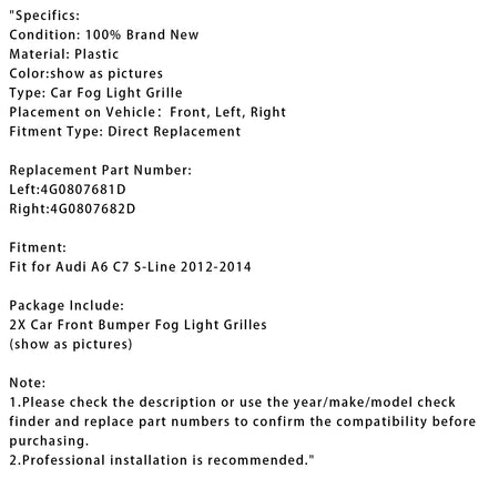 2X Auto Front Stoßstange Nebel Licht Gitter Für Audi A6 C7 S-Linie 2012-2014