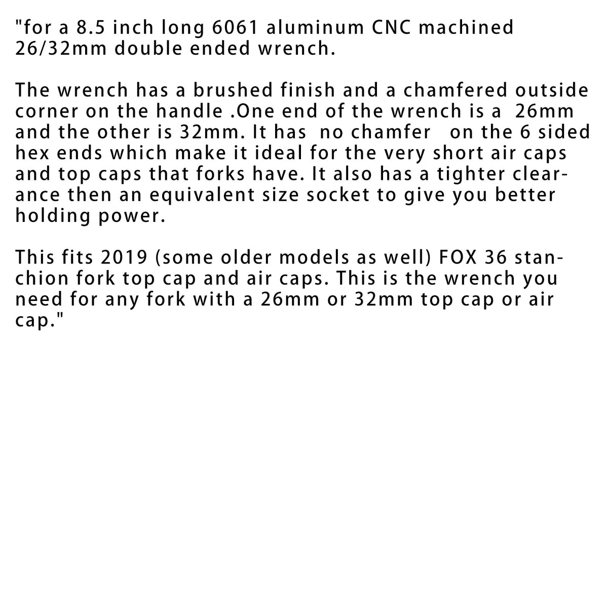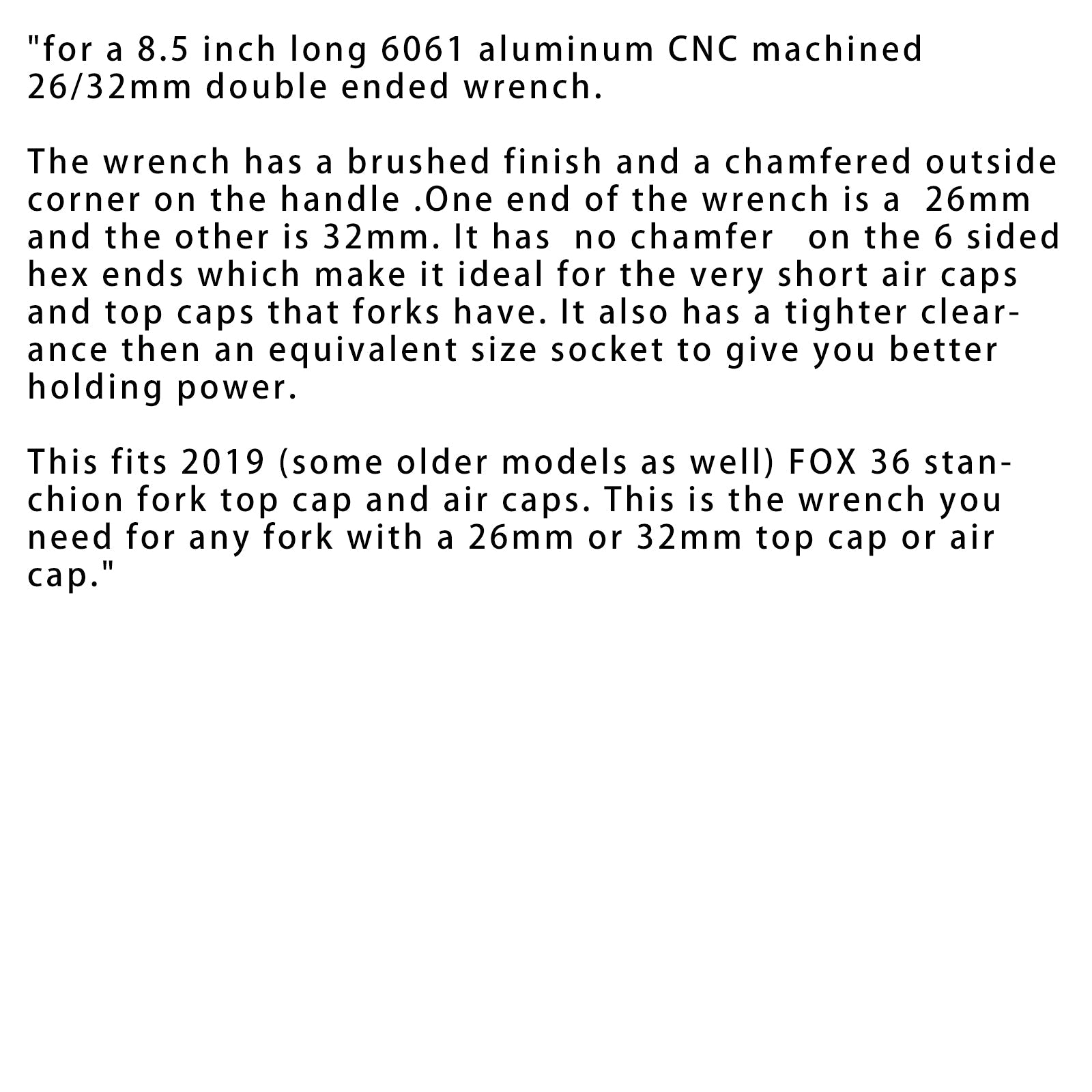 Passt auf die obere Kappe und die Luftkappen der FOX 36-Standrohrgabel (Modelljahr 2019, auch einige ?ltere Modelle). Dies ist der Schraubenschlüssel, den Sie für jede Gabel mit einer oberen Kappe oder Luftkappe von 26 mm oder 32 mm ben?tigen.