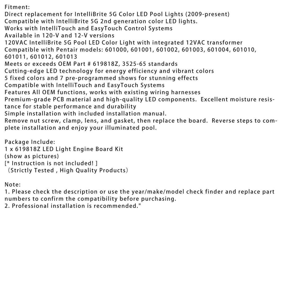 1. 【Hervorragende Kompatibilit?t】 Ersatz für IntelliBrite 5G Farb-LED-Poolleuchten ab 2009. Kompatibel mit IntelliBrite 5G Farb-LED-Leuchten der 2. Generation. Passend für folgende Pentiar LED-Schwimmbad- und Spa-Leuchten: 601000, 601001, 601002, 601003, 601004, 601010, 601011, 601012, 601013. Professionell entwickelt und getestet, um die OEM-Teilenummer 619818Z, 3525-65 zu erfüllen oder zu übertreffen.