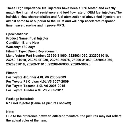 6 STüCKE Kraftstoffinjektor 23250-31060 Passend für Toyota Tacoma 4Runner FJ Cruiser 23250-31010