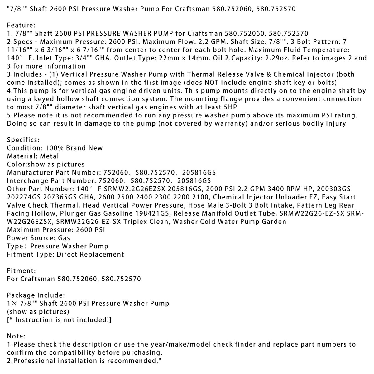7/8 Zoll Welle 2600 PSI Hochdruckreinigerpumpe für Craftsman 580.752060, 580.752570