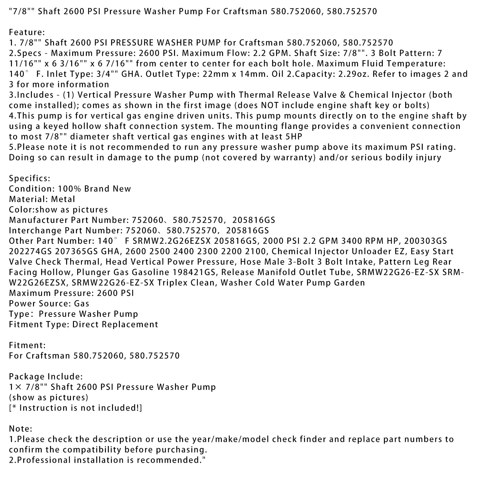 1. 7/8 Zoll Welle 2600 PSI HOCHDRUCKWASSERPUMPE für Craftsman 580.752060, 580.752570