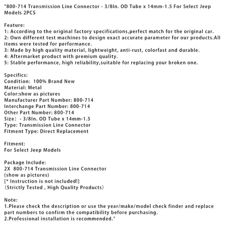 800-714 Übertragungsleitungsanschluss - 3/8 Zoll Außendurchmesser Rohr x 14 mm-1,5 Für ausgewählte Jeep-Modelle 2 STK