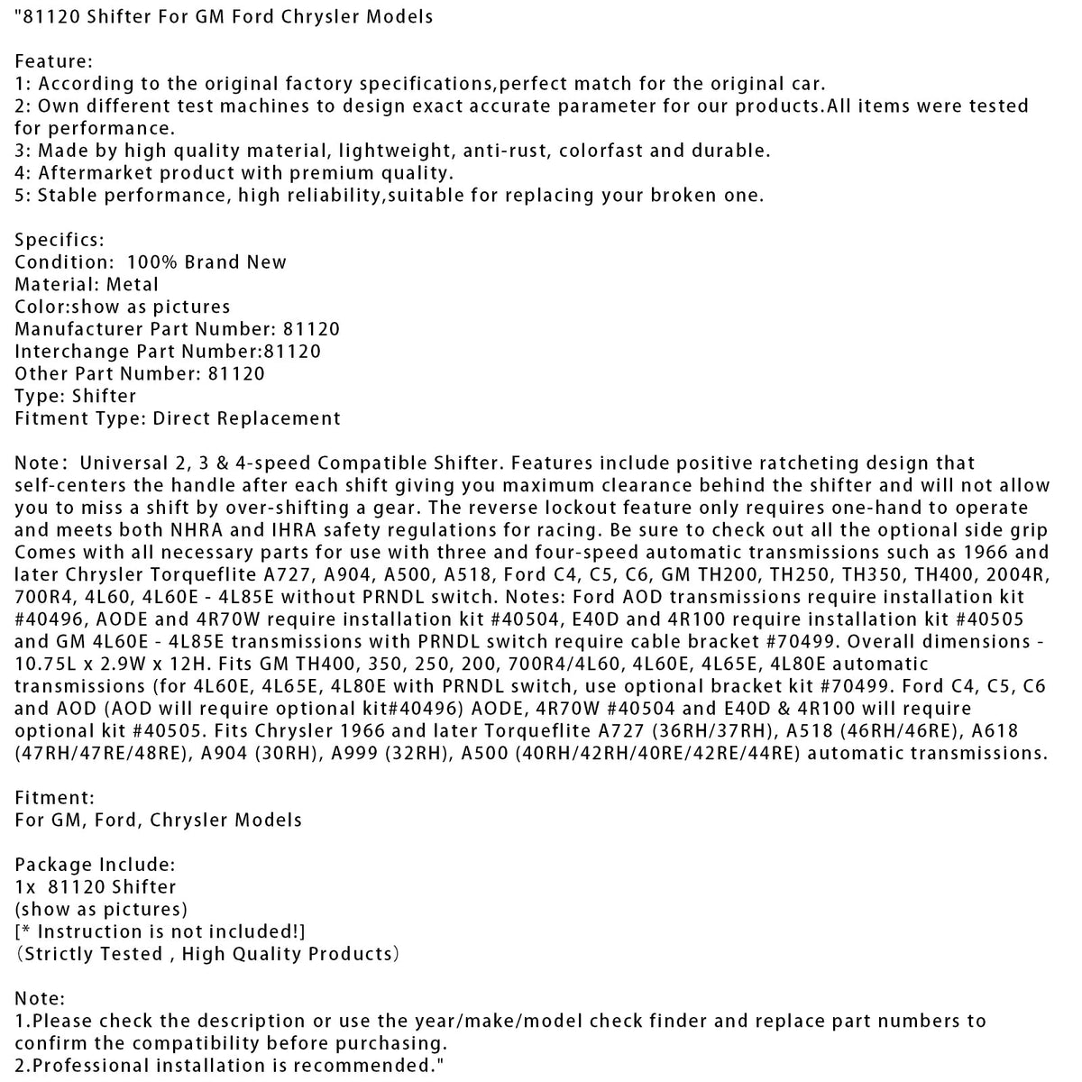 Hinweis: Universeller 2-, 3- und 4-Gang-Schalthebel. Zu den Funktionen gehört ein positives Ratschendesign, das den Griff nach jedem Schaltvorgang selbstzentriert, wodurch Sie maximalen Freiraum hinter dem Schalthebel haben und kein Schalten durch Überschalten eines Gangs verpassen. Die Rückwärtsgangsperre ist einhändig bedienbar und erfüllt die Sicherheitsvorschriften der NHRA und IHRA für den Rennsport. Beachten Sie unbedingt die optionalen Seitengriffe. Wird mit allen notwendigen Teilen für die Verwendung mit Drei- und Viergang-Automatikgetrieben geliefert, z. B. Chrysler Torqueflite A727, A904, A500, A518 ab 1966, Ford C4, C5, C6, GM TH200, TH250, TH350, TH400, 2004R, 700R4, 4L60, 4L60E – 4L85E ohne PRNDL-Schalter. Hinweise: Ford AOD-Getriebe erfordern das Installationskit Nr. 40496, AODE und 4R70W erfordern das Installationskit Nr. 40504, E40D und 4R100 erfordern das Installationskit Nr. 40505 und GM 4L60E - 4L85E-Getriebe mit PRNDL-Schalter erfordern die Kabelhalterung Nr. 70499. Gesamtabmessungen: 10,75 L x 2,9 B x 12 H. Passend für GM TH400, 350, 250, 200, 700R4/4L60, 4L60E, 4L65E, 4L80E Automatikgetriebe (für 4L60E, 4L65E, 4L80E mit PRNDL-Schalter verwenden Sie das optionale Halterungskit Nr. 70499. Ford C4, C5, C6 und AOD (AOD erfordert das optionale Kit Nr. 40496). AODE, 4R70W Nr. 40504 und E40D & 4R100 erfordern das optionale Kit Nr. 40505. Passend für Chrysler 1966 und später Torqueflite A727 (36RH/37RH), A518 (46RH/46RE), A618 (47RH/47RE/48RE), A904 (30RH), A999 (32RH), A500 (40RH/42RH/40RE/42RE/44RE) Automatikgetriebe.
