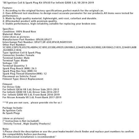 8-teiliges Zündspulen- und Zündkerzen-Set UF650 für Infiniti QX80 5.6L V8 2014-2019