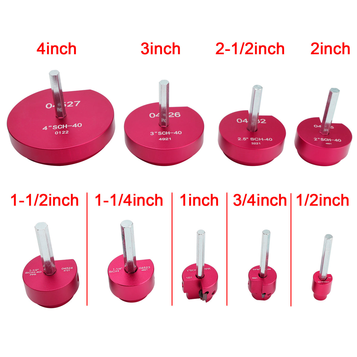 3: Multiple combination set: Kit with1/2"(PPR50), 3/4"(PPR75), 1"(PPR100), 1 1/4"(PPR125), 1 1/2"(PPR150), 2"(PPR200), 2 1/2"(PPR250), 3"(PPR300), 4"(PPR400), 9 Piece,Fits into standard 1/2 inch drill.