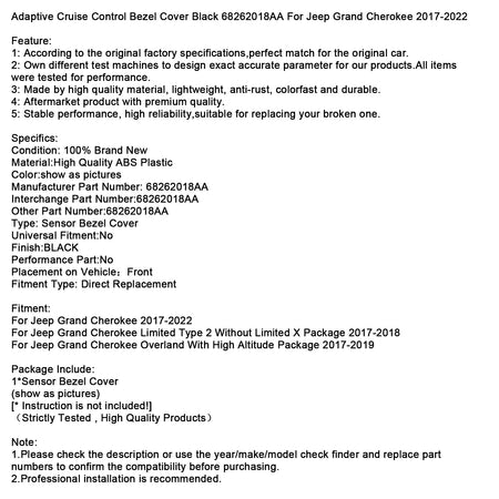 Adaptive Cruise Control Lünette Abdeckung Schwarz 68262018AA Für Jeep Grand Cherokee 2017-2022