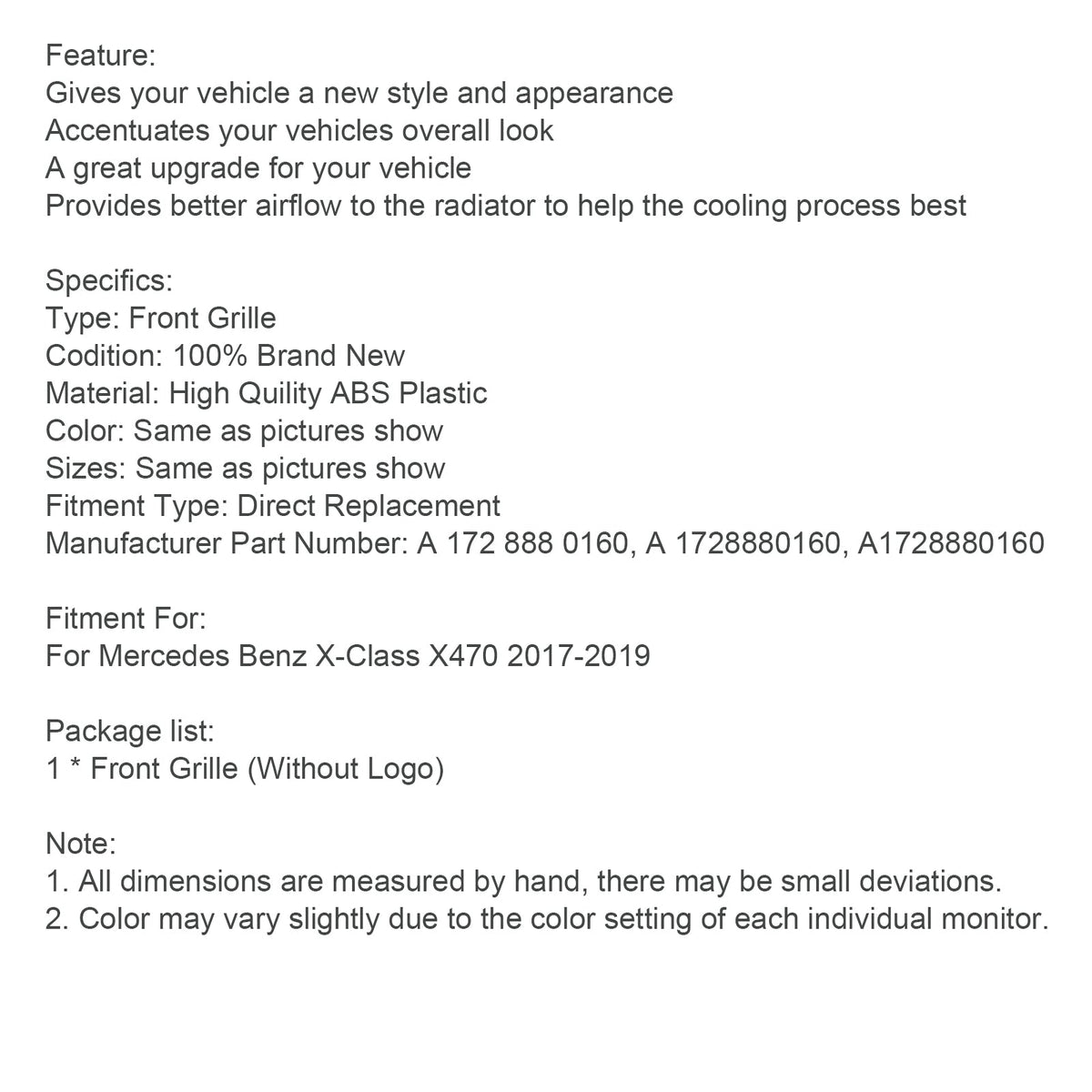 Schwarzer Frontgrill für die Stoßstange, passend für Mercedes Benz X-Klasse X470 2017–2019