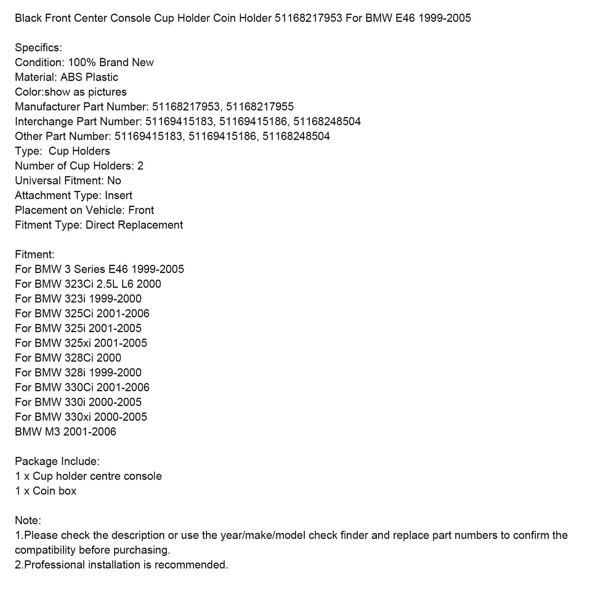Schwarz Front Center Console Tasse Halter Münze Halter 51168217953 Für BMW E46 1999-2005