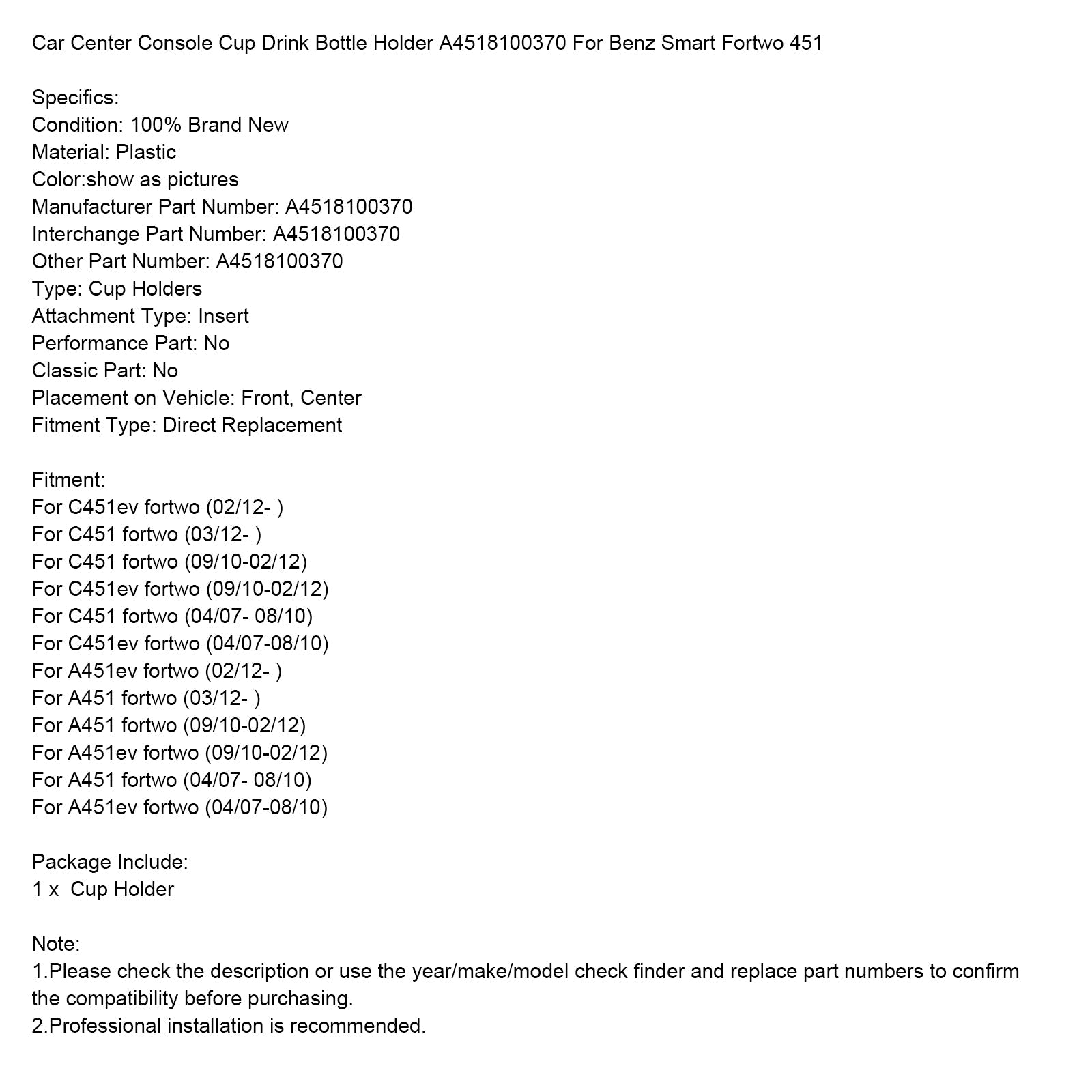 Auto Center Console Tasse Trinken Flasche Halter A4518100370 Für Benz Smart Fortwo 451