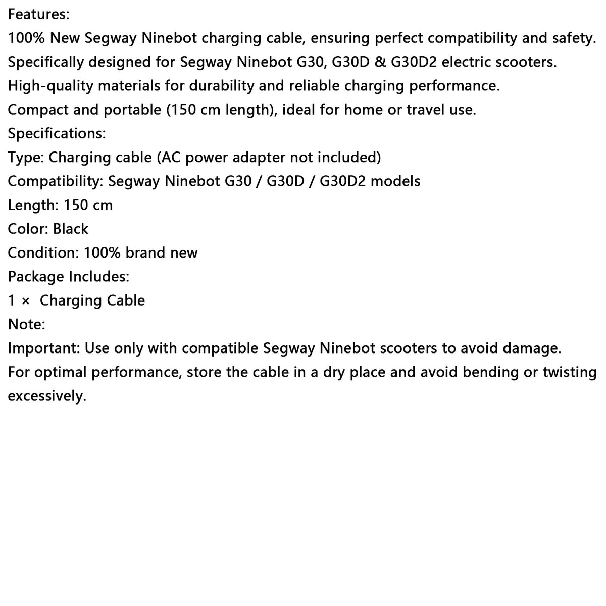 100 % neues Segway-Ninebot-Ladekabel, das perfekte Kompatibilität und Sicherheit gewährleistet.