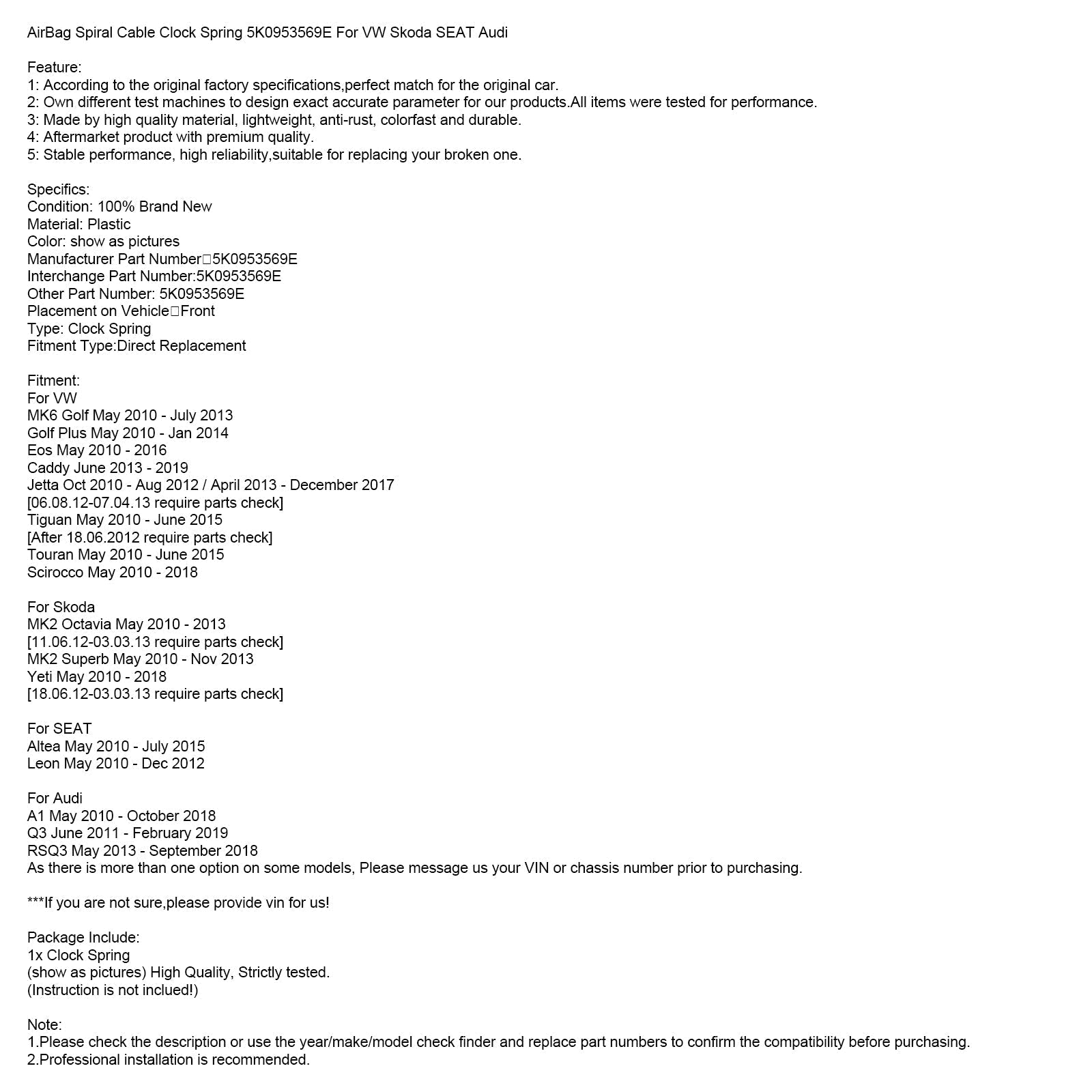 Produkt: AirBag Spiralkabel Wickelfeder 5K0953569E Für VW, Skoda, SEAT, Audi