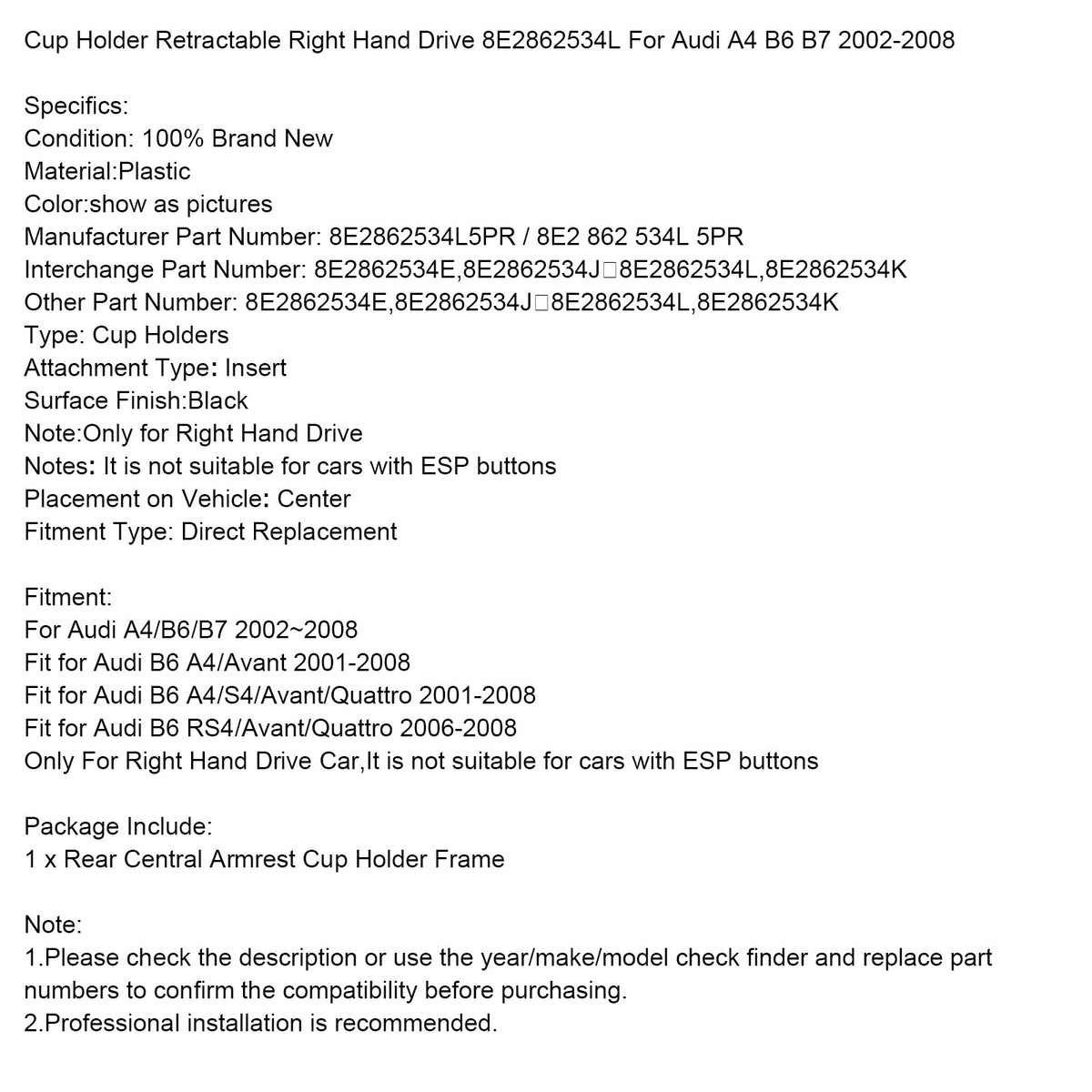 Getränkehalter Versenkbare Rechtslenker 8E2862534L Für Audi A4 B6 B7 2002-2008