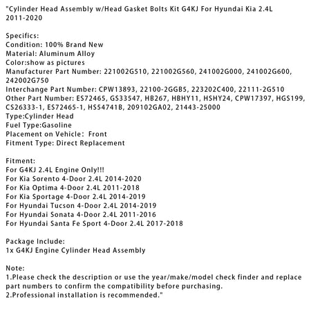 Zylinderkopfbaugruppe mit Kopfdichtungsschraubensatz G4KJ für Hyundai Kia 2.4L 2011-2020