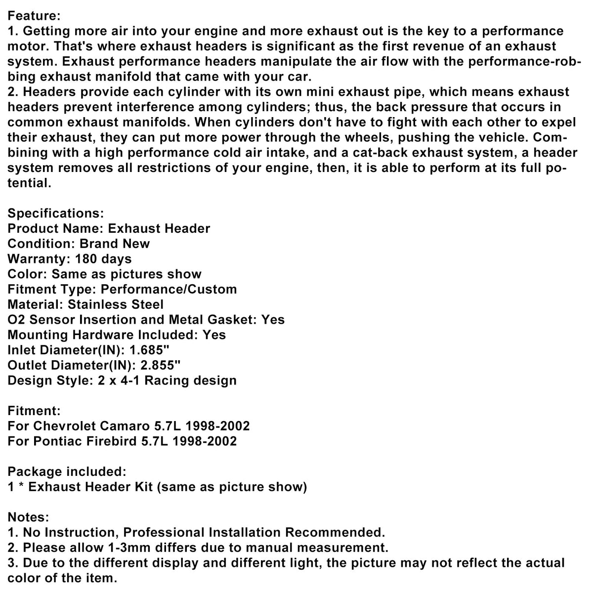 Abgaskrümmer Header Fit Chevy Camaro 1998-2002 Fit Pontiac Firebird 5.7L