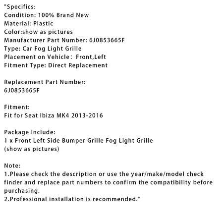 Linke Seite Nebelscheinwerfer Kühlergrill Passend für Seat Ibiza MK4 2013-2016