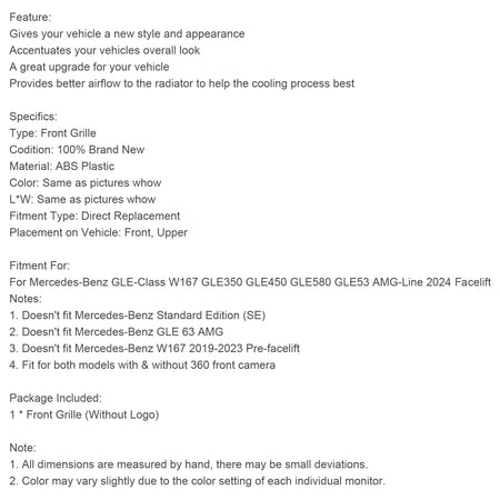Frontstoßstangengrill Grille Fit Mercedes Benz W167 GLE350 GLE450 AMG-Line 2024