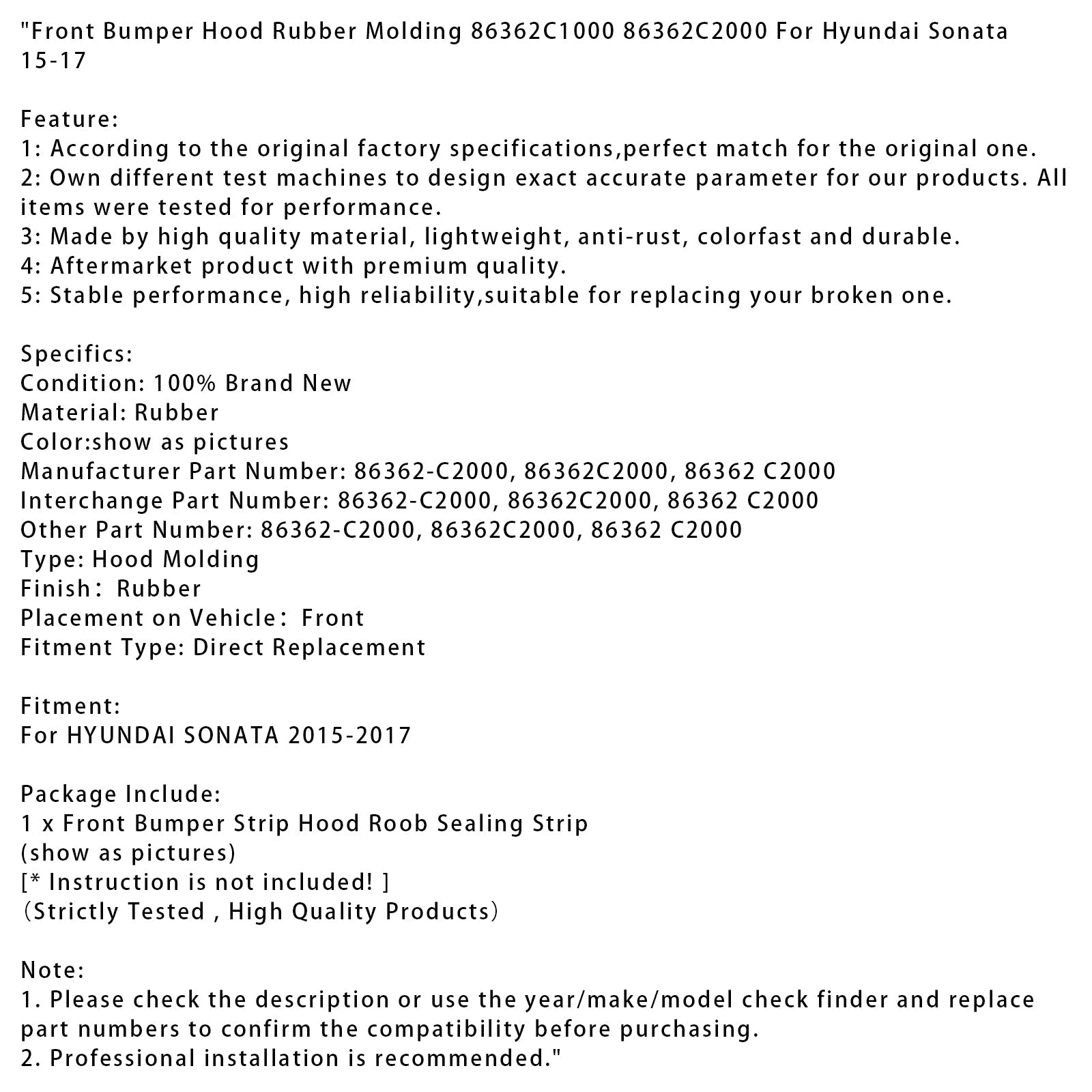 2015-2017 Hyundai Sonata Frontstoßstange Haube Gummiformteil 86362C1000 86362C2000