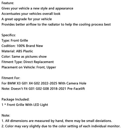 2022-2025 BMW X3 G01 X4 G02 Glänzend schwarzer Nierengrill für die Frontstoßstange mit Kameraloch