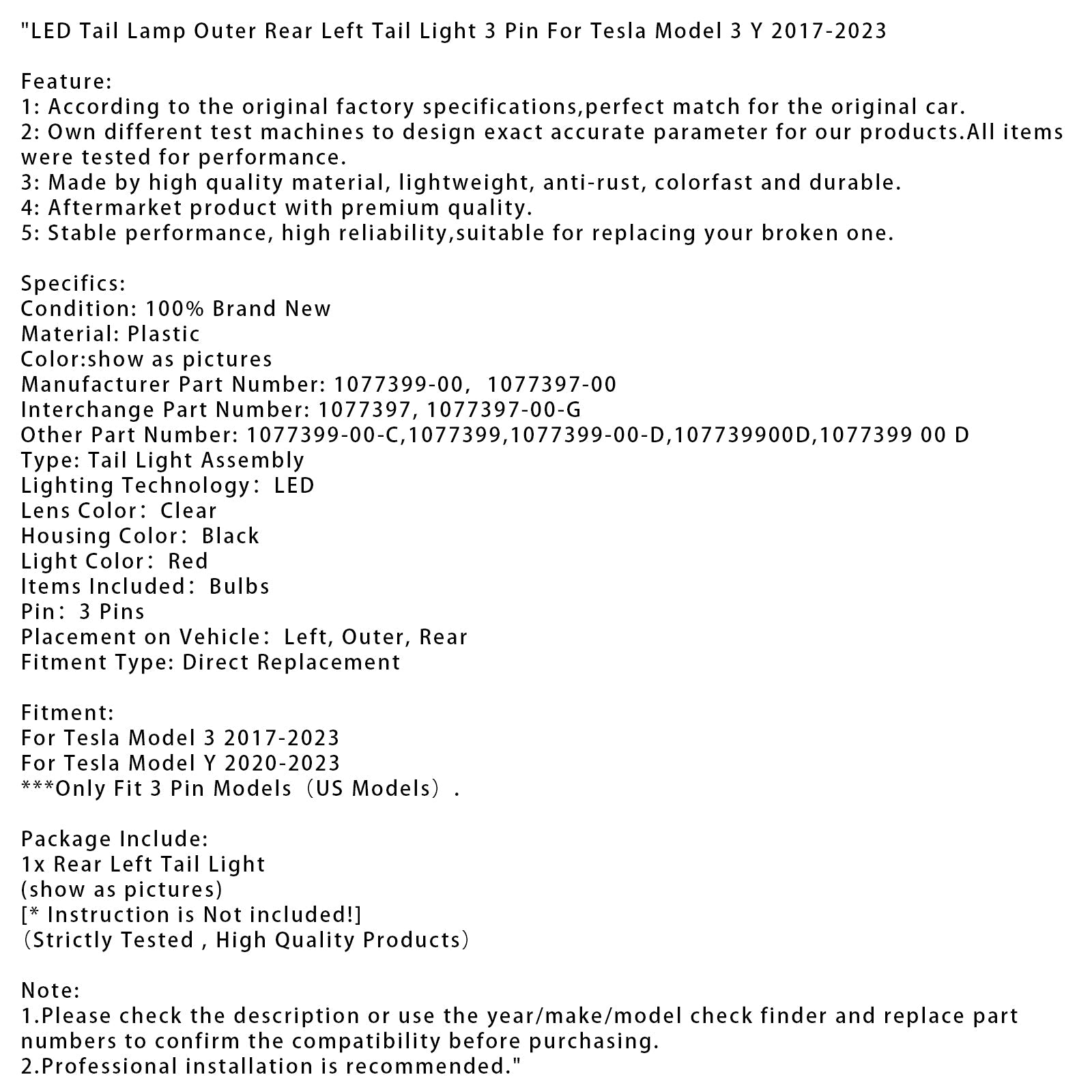 LED Rücklicht außen hinten links Rücklicht 3-polig für Tesla Model 3 Y 2017-2023