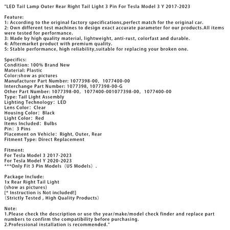 LED Rücklicht Außen Hinten Rechts Rücklicht 3 Pin Für Tesla Modell 3 Y 2017-2023