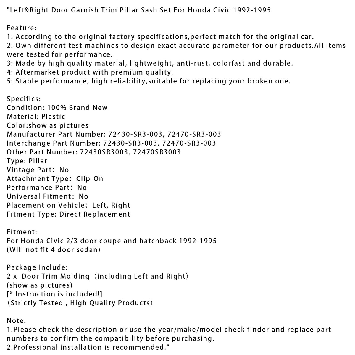 1992–1995 Honda Civic 2/3 Türer Coupé und Fließheck links und rechts Tür Zierleiste Zierleiste Säule Flügel Set SLJ-1173A-BK