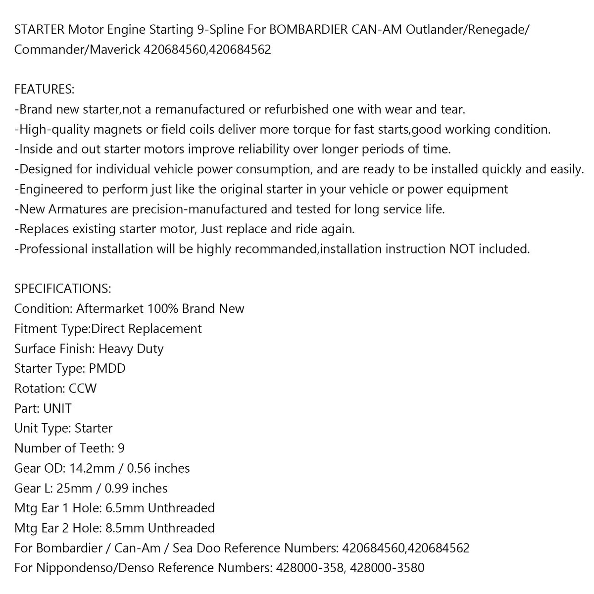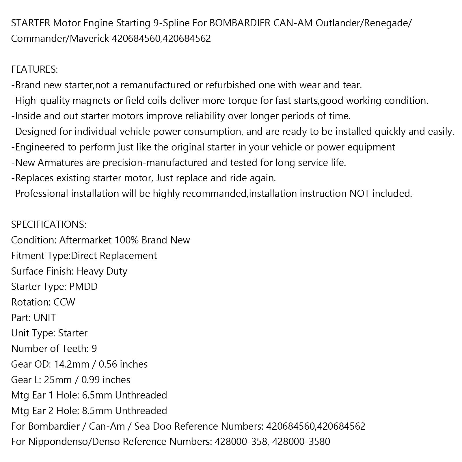 Startermotormotor Start 9-Spline für Bombardier Can-Am Outlander/Renegade/Commander/Maverick 420684560.420684562