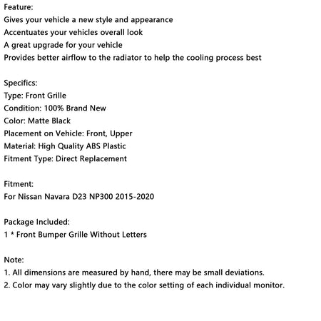 2015-2020 Nissan Navara NP300 D23 Mattschwarzer Kühlergrill für die Frontsto?stange