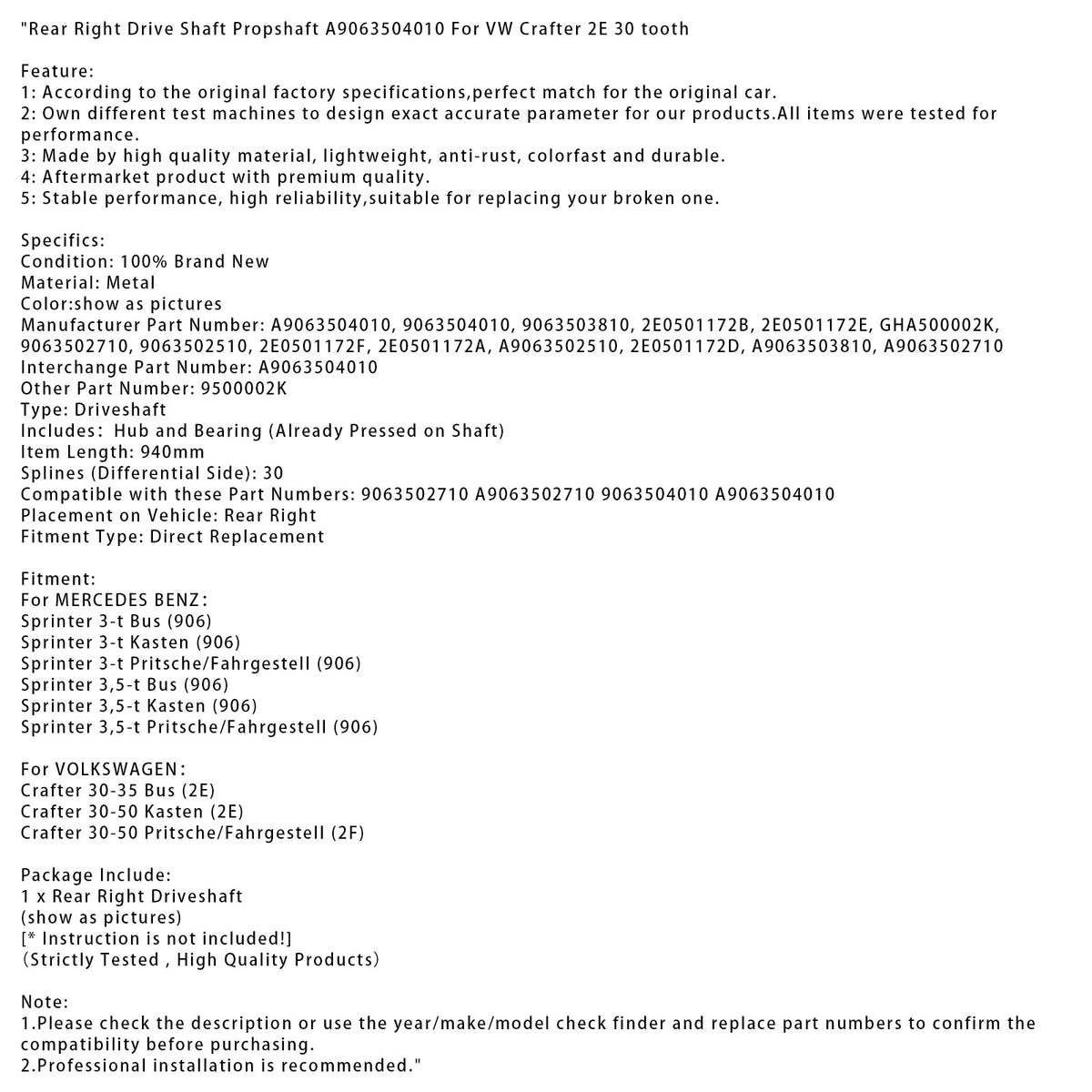 Hinten Rechts Antriebswelle Innenwelle A9063504010 Für VW Crafter 2E 30 zahn
