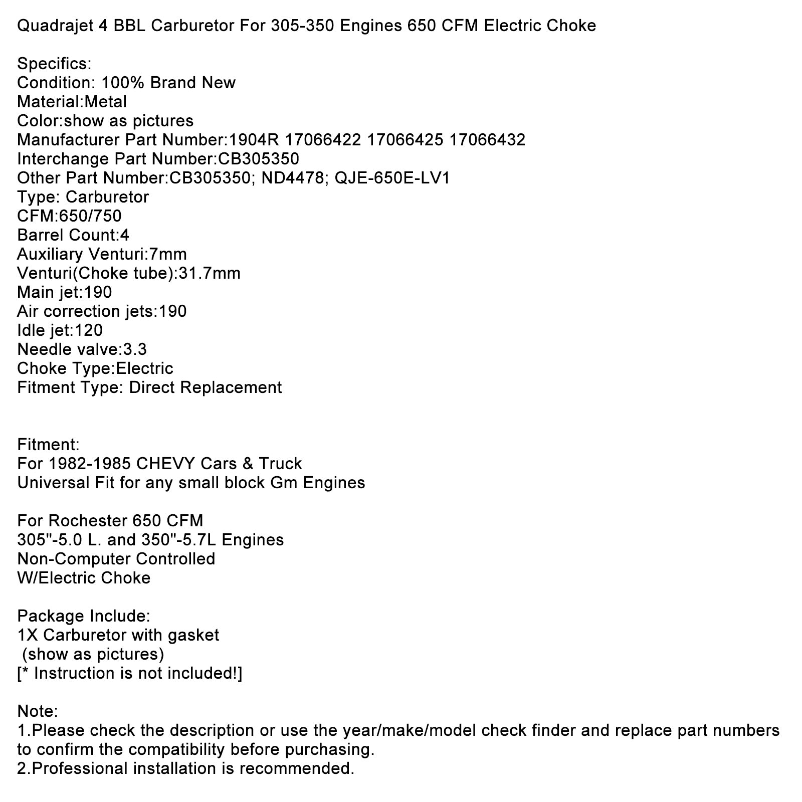Quadrajet 4 BBL Carburetor For 305-350 Engines 650 CFM Electric Choke