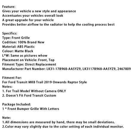 Raptor Style Front Bumper Grille 2467809 Fit Ford Transit MK8 Trail 2019-Onwards
