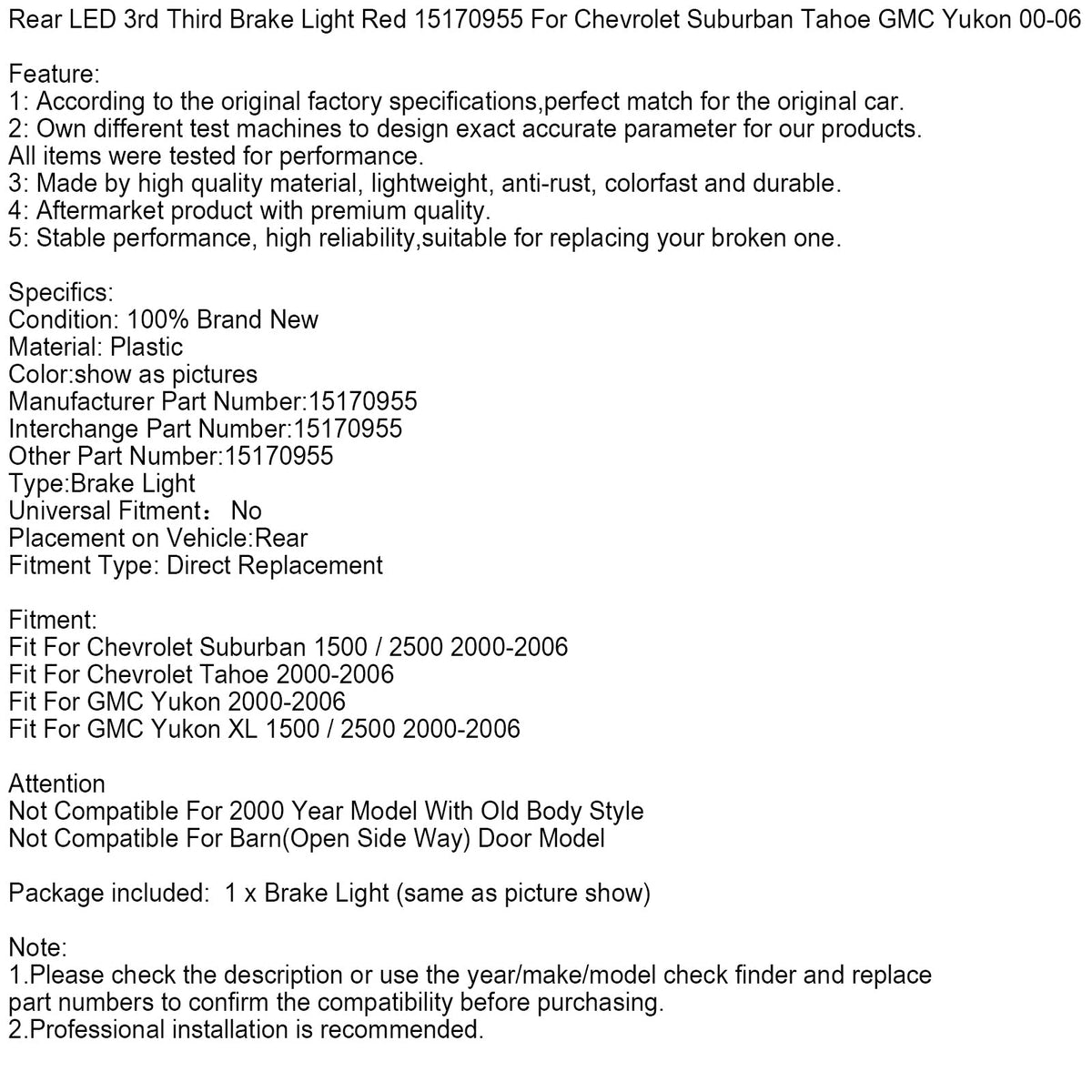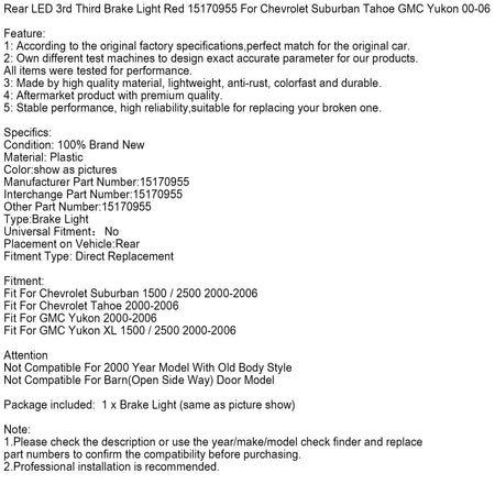 Dritte LED-Bremsleuchte hinten, rot, Teilenummer 15170955, passend für Chevrolet Suburban, Tahoe und GMC Yukon (Baujahre 2000–2006)