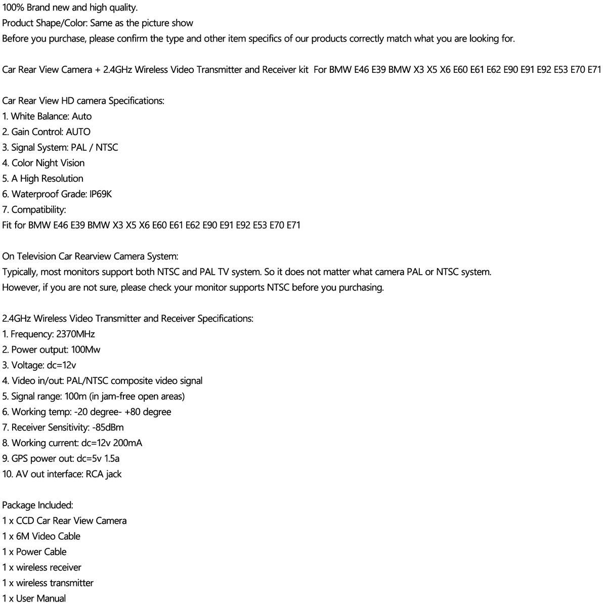 English 100% Brand new and high quality. Product Shape/Color: Same as the picture show Before you purchase, please confirm the type and other item specifics of our products correctly match what you are looking for. Car Rear View Camera + 2.4GHz Wireless Video Transmitter and Receiver kit For BMW E46 E39 BMW X3 X5 X6 E60 E61 E62 E90 E91 E92 E53 E70 E71 Car Rear View HD camera Specifications: 1. White Balance: Auto 2. Gain Control: AUTO 3. Signal System: PAL / NTSC 4. Color Night Vision 5. A High Resolution 6. Waterproof Grade: IP69K 7. Compatibility: Fit for BMW E46 E39 BMW X3 X5 X6 E60 E61 E62 E90 E91 E92 E53 E70 E71 On Television Car Rearview Camera System: Typically, most monitors support both NTSC and PAL TV system. So it does not matter what camera PAL or NTSC system. However, if you are not sure, please check your monitor supports NTSC before you purchasing. 2.4GHz Wireless Video Transmitter and Receiver Specifications: 1. Frequency: 2370MHz 2. Power output: 100Mw 3. Voltage: dc=12v 4. Video in/out: PAL/NTSC composite video signal 5. Signal range: 100m (in jam-free open areas) 6. Working temp: -20 degree- +80 degree 7. Receiver Sensitivity: -85dBm 8. Working current: dc=12v 200mA 9. GPS power out: dc=5v 1.5a 10. AV out interface: RCA jack Feature: Wireless RCA video transmitter & receiver kit for Car rear view camera Wireless RCA video receiver/transmitter; avoid complicated wiring, To be used with in-car monitor, head unit, DVD player and camera, etc. Receiver/transmitter frequency: 2370MHz Av in/out: PAL/NTSC Composite video signal, RCA jack Receiver/transmitter distance: 100m (in jam-free open areas) Wireless receiver transmitter takes no trouble with running video cable. Mainly used for wireless connection on light vehicles for video output to monitor, head unit, DVD player and camera, Etc. Wireless RCA Video receiver / transmitter; avoid complicated wiring, to be used with in-car monitor, backup system. Only when you pull reverse, monitor will automatic show backup picture. You could connect all parts to constant power or 12V battery, monitor will show picture full time. Package Included: 1 x CCD Car Rear View Camera 1 x 6M Video Cable 1 x Power Cable 1 x wireless receiver 1 x wireless transmitter 1 x User Manual Deutsch 100% nagelneu und hohe Qualität. Produktform / Farbe: Wie auf dem Bild gezeigt Bitte bestätigen Sie vor dem Kauf, dass der Typ und andere Artikelspezifikationen unserer Produkte genau Ihren Vorstellungen entsprechen. Auto Rückfahrkamera + 2,4 GHz Wireless Video Sender und Empfänger Kit Für BMW E46 E39 BMW X3 X5 X6 E60 E61 E62 E90 E91 E92 E53 E70 E71 Auto Rückansicht HD-Kamera Technische Daten: 1. Weißabgleich: Auto 2. Kontrolle erlangen: AUTO 3. Signalsystem: PAL / NTSC 4. Farbe Nachtsicht 5. Eine hohe Auflösung 6. Wasserdicht: IP69K 7. Kompatibilität: Passend für BMW E46 E39 BMW X3 X5 X6 E60 E61 E62 E90 E91 E92 E53 E70 E71 Rückfahrkamerasystem im Fernsehen: Normalerweise unterstützen die meisten Monitore sowohl das NTSC- als auch das PAL-TV-System. Es spielt also keine Rolle, welches Kamera-PAL- oder NTSC-System. Wenn Sie sich jedoch nicht sicher sind, überprüfen Sie vor dem Kauf, ob Ihr Monitor NTSC unterstützt. Technische Daten des drahtlosen 2,4-GHz-Videosenders und -empfängers: 1. Frequenz: 2370 MHz 2. Ausgangsleistung: 100 MW 3. Spannung: Gleichstrom = 12V 4. Videoeingang / -ausgang: PAL / NTSC-Composite-Videosignal 5. Signalreichweite: 100 m (in störungsfreien offenen Bereichen) 6. Arbeitstemperatur: -20 Grad- +80 Grad 7. Empfängerempfindlichkeit: -85 dBm 8. Arbeitsstrom: Gleichstrom = 12 V, 200 mA 9. GPS-Stromausfall: Gleichstrom = 5 V, 1,5 A 10. AV-Ausgangsschnittstelle: Cinch-Buchse Merkmal: Drahtloses Cinch-Video-Sender- und Empfänger-Kit für die Rückfahrkamera Drahtloser Cinch-Videoempfänger / -sender; Vermeiden Sie komplizierte Verkabelungen. Zur Verwendung mit Monitoren im Auto, Headunit, DVD-Player und Kamera usw. Empfänger- / Senderfrequenz: 2370 MHz Av in / out: PAL / NTSC Composite-Videosignal, Cinch-Buchse Empfänger- / Senderentfernung: 100 m (in störungsfreien offenen Bereichen) Der drahtlose Empfängersender hat keine Probleme mit dem Verlegen des Videokabels. Wird hauptsächlich für die drahtlose Verbindung in leichten Fahrzeugen für die Videoausgabe an Monitor, Headunit, DVD-Player und Kamera usw. verwendet. Drahtloser Cinch-Videoempfänger / -sender; Vermeiden Sie komplizierte Verkabelungen, die mit dem Backup-System des Fahrzeugmonitors verwendet werden können. Nur wenn Sie rückwärts ziehen, zeigt der Monitor automatisch ein Backup-Bild an. Sie können alle Teile an eine Konstantstromversorgung oder eine 12-V-Batterie anschließen. Der Monitor zeigt das Bild in Vollzeit an. Lieferinhalt: 1 x CCD Auto Rückfahrkamera 1 x 6M Videokabel 1 x Netzkabel 1 x Funkempfänger 1 x Funksender 1 x Benutzerhandbuch