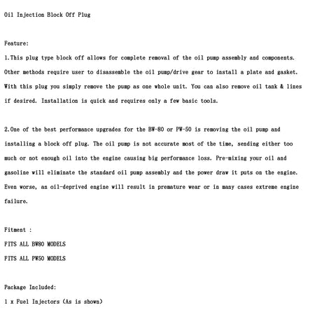 2. Eine der besten Leistungssteigerungen für den BW-80 oder PW-50 ist der Ausbau der ?lpumpe und der Einbau eines Absperrstopfens. Die ?lpumpe ist die meiste Zeit nicht genau und schickt entweder zu viel oder zu wenig ?l in den Motor, was zu gro?en Leistungsverlusten führt. Durch das Vormischen von ?l und Benzin entf?llt die Standard-?lpumpenbaugruppe und die Leistungsaufnahme, die sie auf den Motor ausübt. Schlimmer noch, ein ?larmer Motor führt zu vorzeitigem Verschlei? oder in vielen F?llen zu einem extremen Motorausfall.