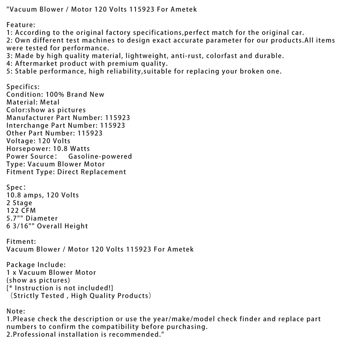 Ametek Vakuumgebl?se/Motor 120 Volt 115923