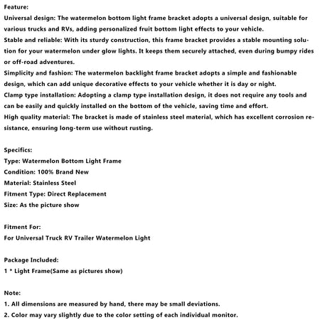 Universelles Design: Die Halterung für den Wassermelonen-Unterlichtrahmen verfügt über ein universelles Design, das für verschiedene LKWs und Wohnmobile geeignet ist und Ihrem Fahrzeug personalisierte Frucht-Unterlichteffekte verleiht.
