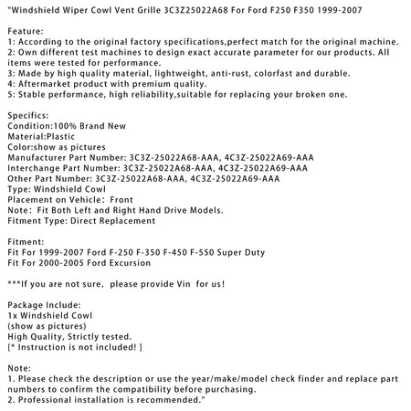 Scheibenwischer Gugel Vent Grille 3C3Z25022A68 Für Ford F250 F350 1999-2007