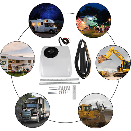 - 【Vorteil】:Gegenwärtig sind diese DC 12V Produkte weit verbreitet in den Belüftungs- und Klimasystemen in den Kabinen von Lastwagen, Traktoren, Wohnwagen, Wohnmobilen und Baumaschinen verwendet worden. DC-Klimaanlagen-Kits sind sehr einfach anzuschließen und können in engen Räumen und extrem heißen Umgebungen eingesetzt werden!