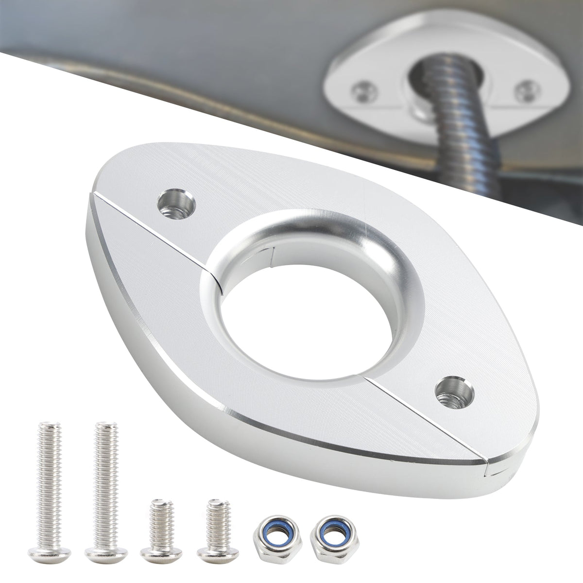 5. 【Installation】 Dies ist ein zweiteiliges Design, die obere und untere H?lfte werden mit der mittleren Schraube zusammengehalten, und dann wird die Halterung mit den verbleibenden 4 Schrauben am Auto befestigt. Sie k?nnen die obere H?lfte der Halterung entfernen, wodurch Sie genügend Platz haben, um die Verkabelung zu installieren oder zu entfernen. Dann schrauben Sie sie einfach zusammen und bringen die Schrauben der Autohalterung wieder an. (Dies passt nicht auf jedes Auto, eine Herstellung ist erforderlich.)