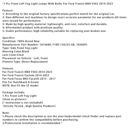 1 Pcs Vorne Links Nebel Licht Lampen Mit Glühbirnen Für Ford Transit MK8 V363 2014-2023