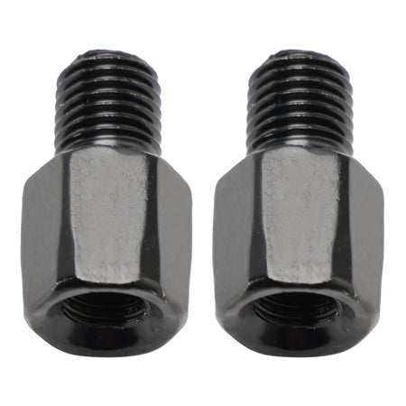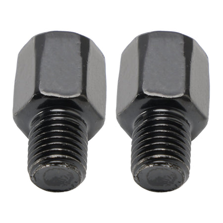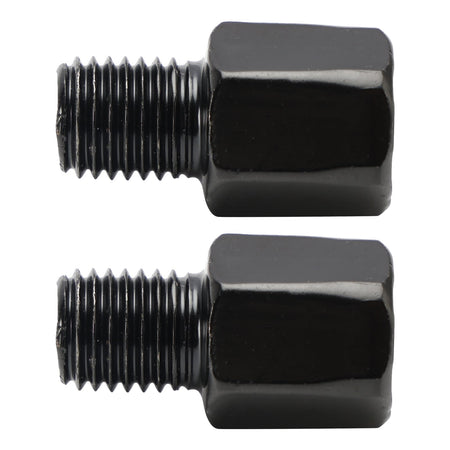 Paar schwarze Motorradspiegeladapter aus Metall.
